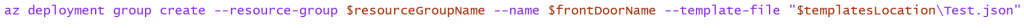 To test this template, we use Azure CLI to deploy to a target resource group, and a deployment name ($frontDoorName in this screenshot – oops!)