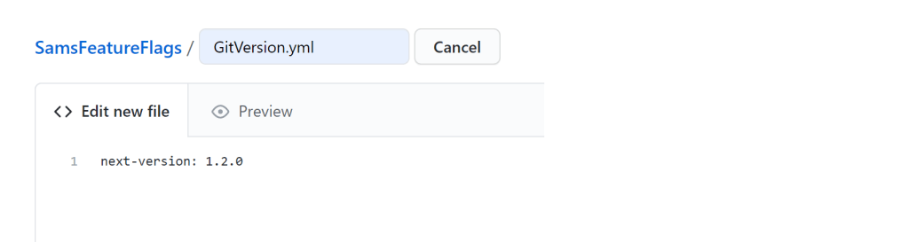 After creating a new feature branch, our first step is to create a new GitVersion.yml file, and add the next version we are will target. Our current version is 1.1.2, we are going to upgrade to 1.2.0 for this release. This “next-version” property is meant to be a seed, we don’t have to update this version for every release, as going forward we will look for the last tagged source first. The text is shown below, as well as a screenshot showing the complete file.