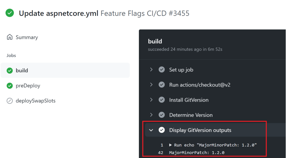 - In the blue highlighted area, we show 3 steps. The first sets up GitVersion, the next determines the version, and the last outputs the version to the console. We can see this version in the screen shot below – which correctly shows 1.2.0, as expected.