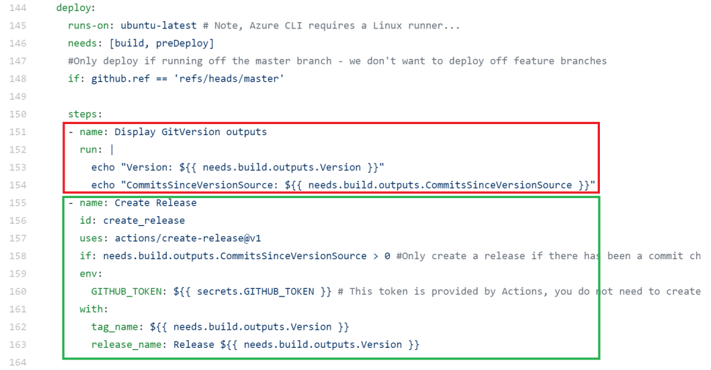 In a subsequent job, we will create the release and tag the code with this release name, as shown in the image below. Note the conditional “if” statement on line 148, to ensure we don’t release our code in a pull request – we only want to release code that has been approved, reviewed and merged through a pull request to keep our quality high.