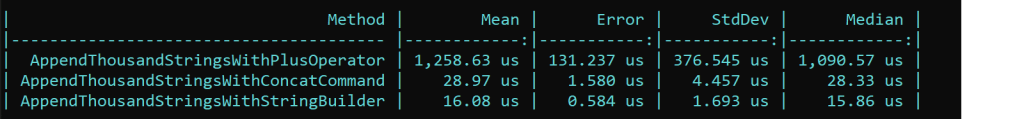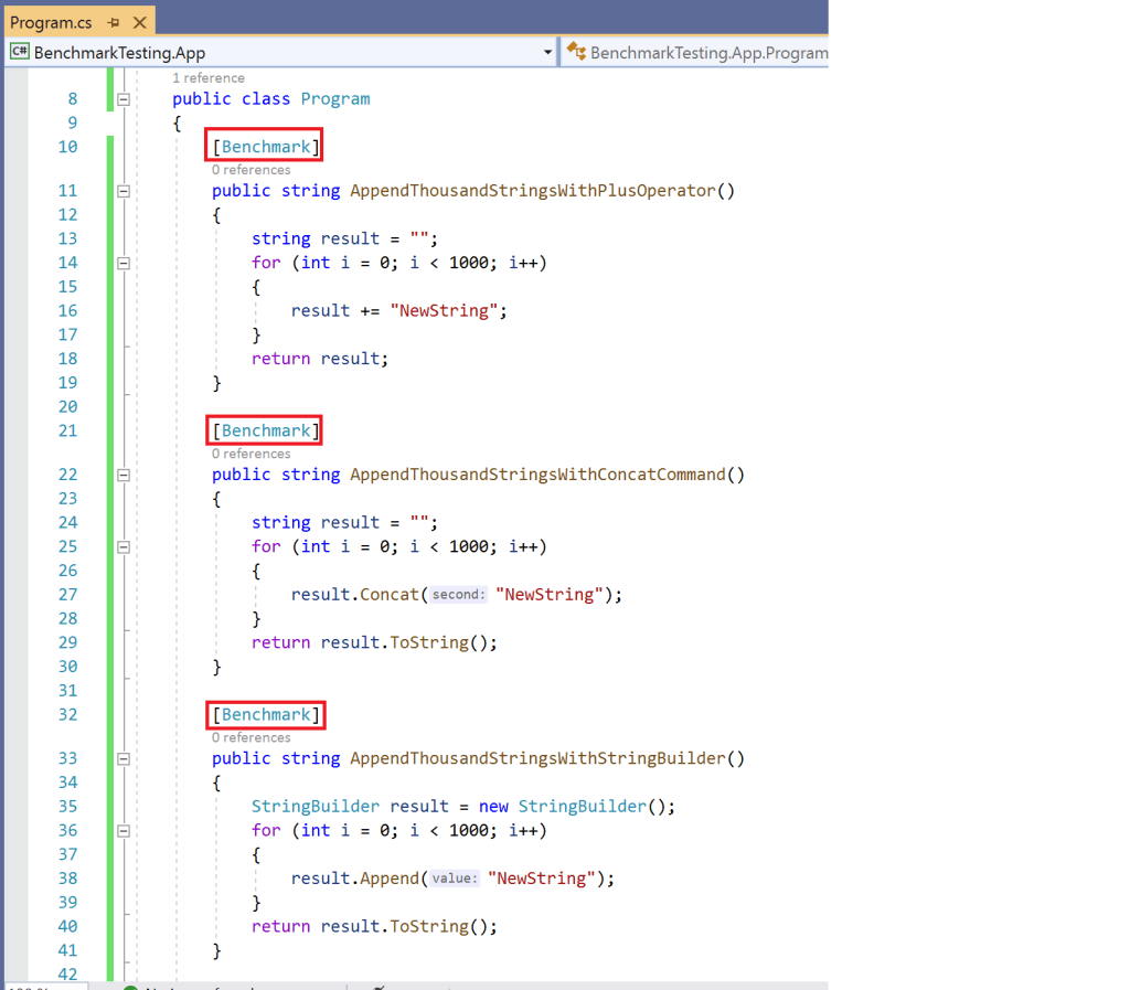 Now we can create some tests. Each test needs the “[Benchmark]” attribute. We create three examples to append the strings with different methods, using the + operator, the “Concat” function from Linq, and using StringBuilder.