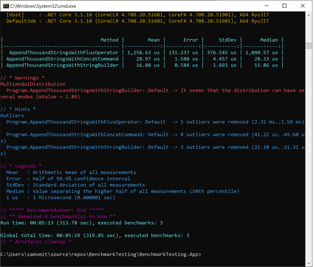 Benchmarking isn’t needed for every project, but if you are developing a NuGet package, or DLL that will do processing, it makes a lot of sense. We are going to use it to tackle an age old problem, string appending. The classic example is that appending a string with the + operator is relatively expensive, for example: