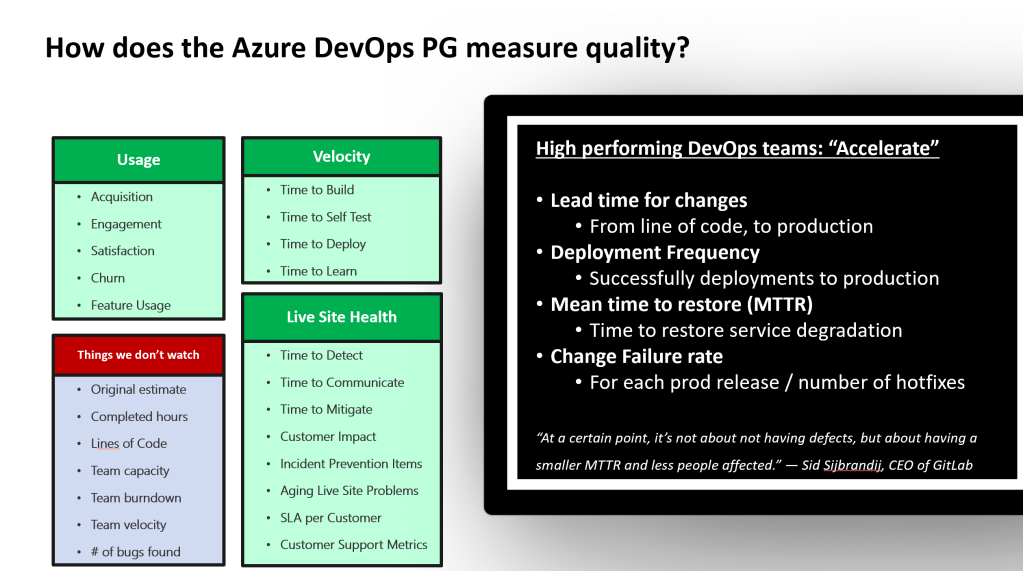 While DORA metrics aren’t perfect, they are the best solution we have for measuring team performance today. Keep in mind that anytime you measure someone’s work, and especially if you are using these metrics for financial incentives, it is human nature to draw the shortest path to the goal. Some of those are good, some not so good. Lines of code has often been used as an example of a poor metric, as you can add as much value deleting a few lines of code, as writing a few new ones – and our software is complicated enough – we certainly don’t need an incentive that encourages developers to write unnecessary code! The late, great, Abel Wang, shared a graphic a few years ago that highlighted learnings the Azure DevOps team had found with their metrics.