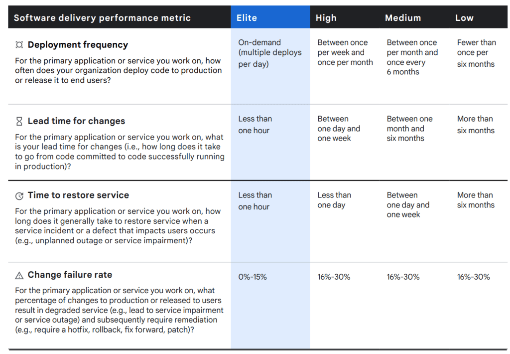 Let’s dive right into the important points first, before exploring the metrics in more detail (I’m assuming you know what DORA metrics are – if you don’t – skip this section, read the rest of the blog, and then return here):